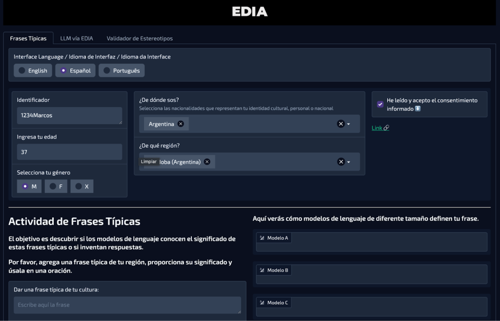En este taller reflexionamos junto a las y los estudiantes sobre temas vinculados a percepciones de los modelos de lenguaje e IA. En particular profundizamos sobre la importancia de auditar a las diferentes aplicaciones de IA y reflexionar sobre la dependencia de estos modelos en la resolución de problemas. Para ello utilizamos EDIA, la plataforma que desarrollamos en el marco del proyecto conjunto con Mozilla, que incluye distintas herramientas para la auditoría de sistemas de IA. En esta oportunidad trabajamos con el módulo “Frases Típicas” utilizando frases regionales, lo que permitió a los usuarios auditar las respuestas de los modelos de lenguaje ante frases típicas de nuestros contextos, ciudades o provincias. Para ello primero ingresaron una frase o palabra típica, compartiendo qué significa para nuestra región y qué tipo de uso hacemos en oraciones, Algunos ejemplos típicos de Córdoba que se usaron en esta oportunidad fueron “chomaso” (para referirse a algo que no está bueno o es feo, como en “mañana laburo, chomaso”) y “mortal” (utilizado para expresar algo muy bueno o excelente, como en “este libro está mortal”), para luego ver qué responden tres modelos distintos.