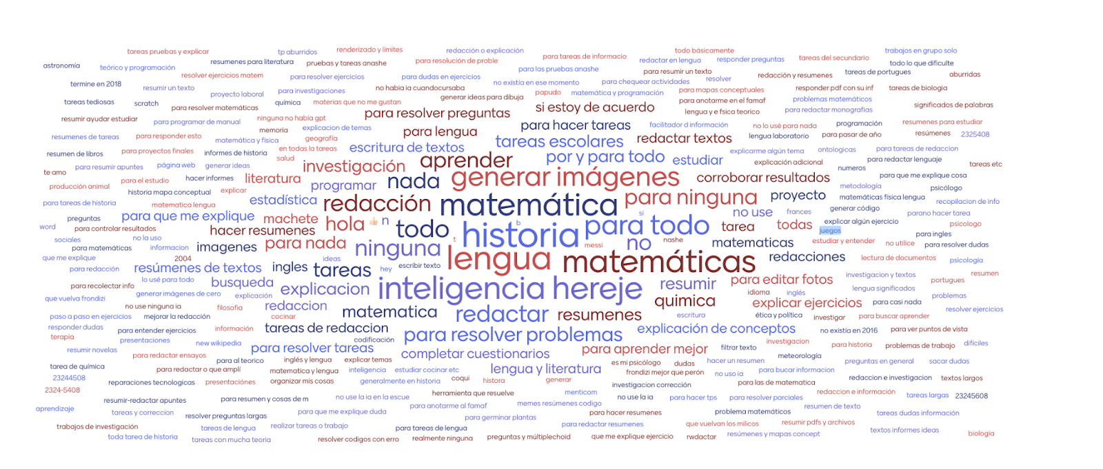 A partir de la pregunta ¿Para qué tipo de tareas usaron aplicaciones como ChatGPT, Gemini u otras en la escuela? Se recolectaron 324 respuestas de 305 personas, que se sintetizan en la siguiente nube de palabras: